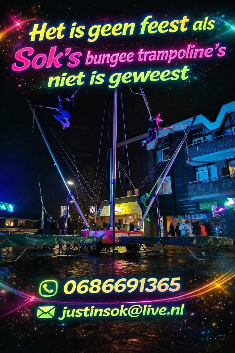 Soks Bungee Trampolines biedt unieke party- en entertainmentservices die iedere gelegenheid onvergetelijk maken. Onze bungee trampolines zijn perfect voor feesten en evenementen, waarbij plezier en avontuur centraal staan.